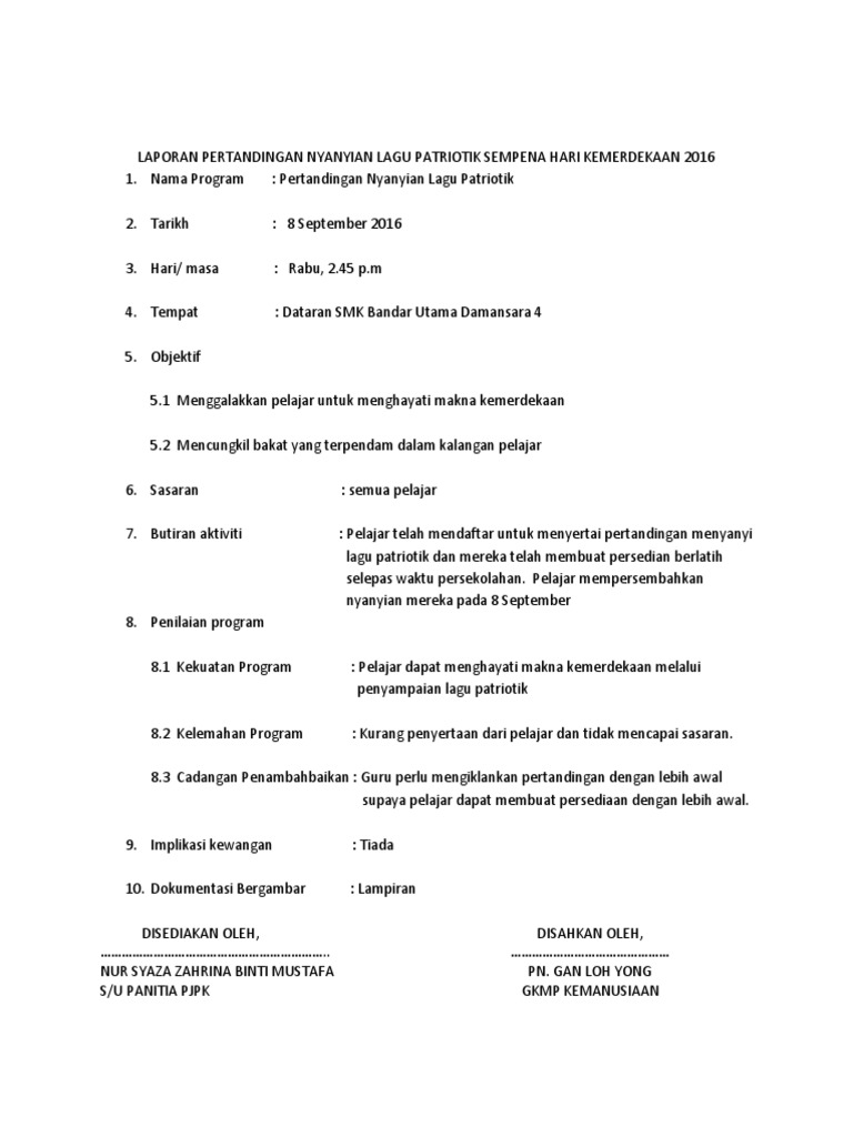 Laporan Pertandingan Nyanyian Lagu Patriotik Sempena Hari ... from imgv2-2-f.scribdassets.com Hari peringatan kemerdekaan republik indonesia jatuh pada hari kamis tanggal 17 agustus 2017. Sumber:pinters.comhai sobat milenials, apa kabarnya? Karangan laporan sambutan hari kemerdekaan di sekolah saya. Segala perancangan dan persiapan untuk sambutan dilakukan seminggu sebelum sambutan iaitu aktiviti sepanjang bulan kemerdekaan. Pemasangan bendera kemerdekaanpun akan dimulai di. Yang artinya, ini merupakan hari istimewa bagi seluruh warga negara indonesia. Persembahan multimedia ini ditayangkan di. Video penuh persembahan pembukaan hari kemerdekaan pada 31 ogos yang lalu.